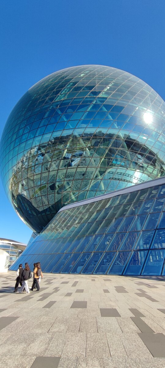 Гуляя по ботаническому саду издалека видели круглое, блестящее, притягивающее к себе внимание здание, и подумали жаль, что не успеваем посетить его. Но сложилось так, что пришлось задержаться и все успеть)) Всемирная выставка в Казахстане проходила в 2017г. и была посвящена энергии будущего. Для выставки был построено стометровое сферическое здание «Нур-Алем», который продолжает работать и в настоящее время. Вход на выставку стоит 1500 тенге с человека. Сама экспозиция располагается на 8 этажах. На первом этаже выставлены национальные украшения и головные уборы. Заметила некоторые экземпляры схожие с якутскими бастына. Серьги и браслеты тоже по строению и узорам схожи с якутскими, но больше всего похожи мужские ремни. Встретили приятного и вежливого робота, предложившего сделать совместное фото. После первого этажа надо сразу подняться на современных стеклянных лифтах до 8 этажа и постепенно спускаться. Сразу после подъема ждет проверка на страх высоты: предстоит пройти по стеклян