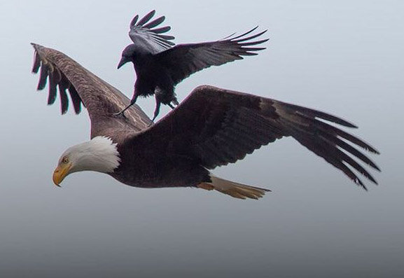 Единственная- птица кто осмеливается клевать орла- это ворон. Он садится на спину и впивается в шею орла. Однако орёл ворона не сбрасывает, не сражается с ним, не тратит на него время и силы. Он просто раскрывает крылья и начинает подниматься вверх в небеса. И чем выше его полёт, тем меньше воздуха остаётся для ворона, и тогда ворон падает вниз. Мораль: когда человек движется к своей цели, ему некогда спорить, кому то что-то доказывать. Устремляйся вперёд, всё остальное отпадёт сама собой.