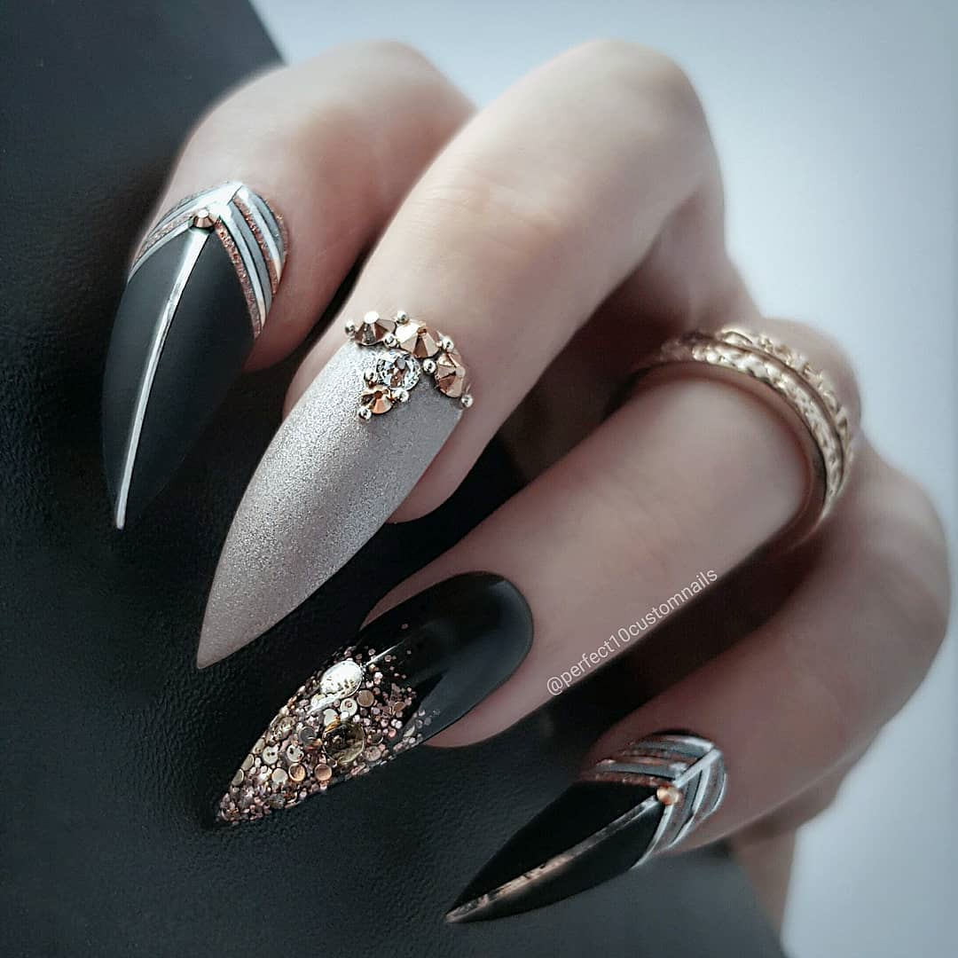 Стразы и блестки на ногтях острой формы не должны быть чрезмерными, чтобы дизайн острых ногтей получился красивым, а не вычурным.