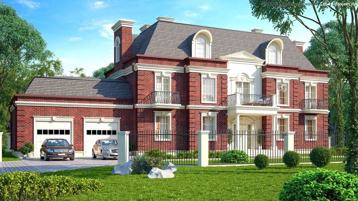 Общая площадь - 512 кв.м. Размеры дома - 28.2 x 17.7 м. И снова здравствуйте! Рассмотрим ещё один симпатичный проект премиум-класса. Этот солидный загородный дом предназначен для постоянного проживания большой семьи из нескольких поколений. Спроектирован он в английском стиле георгианской эпохи и напоминает родовую усадьбу богатого джентельмена и его семьи, а может даже лорда. Все фасады дома смотрятся очень эстетично и элегантно. Контраст стен из красного кирпича с белой отделкой придаёт ему особое изящество. Строгие и величавые пропорции, соразмерное расположение окон, карнизы и молдинги, а также отказ от помпезности, всё это присуще особнякам в георгианском стиле. Очень красиво смотрятся вертикальные фронтоны мансарды. Немного хочется придраться к арочным слуховым окнам, но это дело вкуса. Можно было бы вместо них на переднем фасаде сделать такие же фронтоны какой сделан сзади, для лестницы. А сзади сделать как боковые. И окна заднего фасада малы, и смотрится он от этого как-то пуст