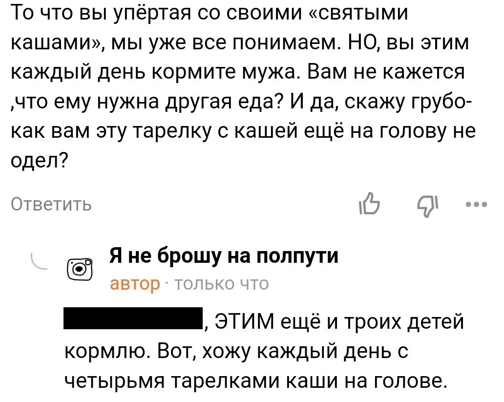 Я делала скриншоты топовых комментариев не для этой статьи, а чтобы отправить мужу. Мы обычно хихикали вместе в течении дня. Даже сформировалось устойчивое выражение - "хрючевы", ударение на Ю, - то есть те, кто постоянно пишет негативные комментарии и называет мою еду хрючевом. Леша приходит с работы и спрашивает: "Ну как там твои хрючевы сегодня?" Чистила телефон и дошла как раз до таких скриншотов, решила все таки выложить. Листайте галерею =====>>> И вторая партия =====>>> И еще =====>>> _______________________________________ Начальный вес: 93,3кг Начальная окр. живота: 121 см* Результаты похудения: 1 месяц: 90,6кг (-2,7кг) живот 120см (-1см) 2 месяц: 90,1кг (-3,2кг) живот 119см (-2см) 3 месяц: 89,4кг (-3,9кг) живот 117см (-4см) 4 месяц: 88,6кг (-4,7кг) живот 116см (-5см) 5 месяц: 88,2кг (-5,1кг) живот 114см (-7см) 6 месяц: 87,1кг (-6,2кг) живот 113см (-8см) 7 месяц: результаты 2 января _______________________________________ Про мою семейную жизнь здесь _________________________
