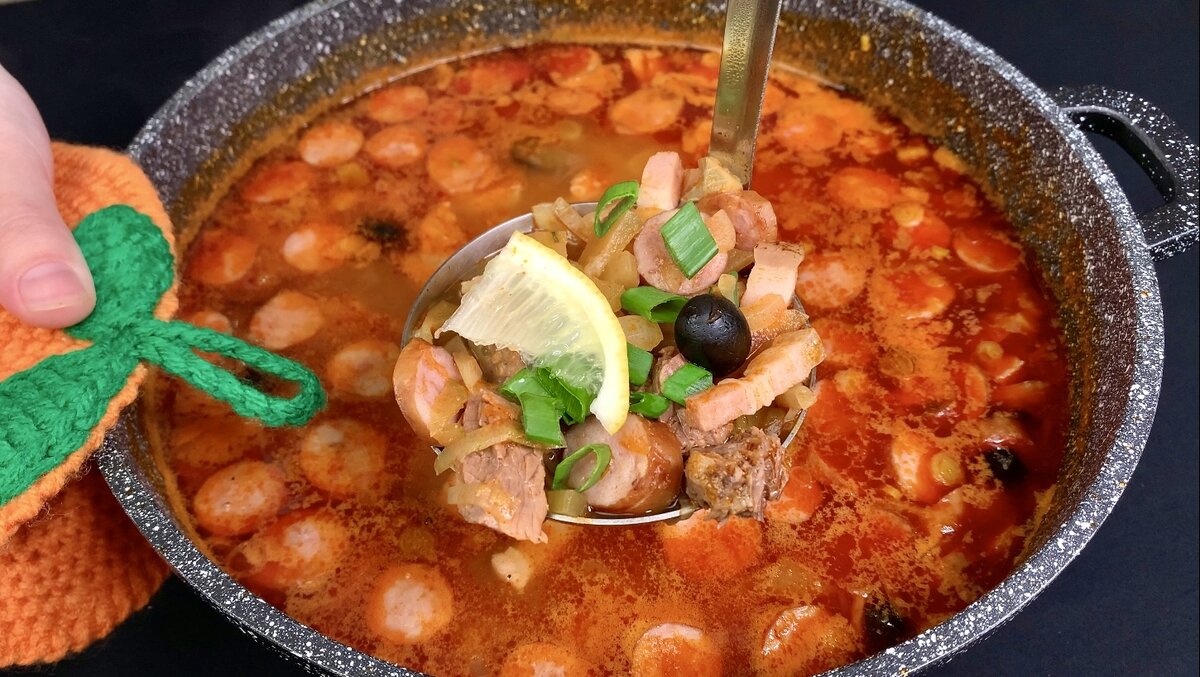 Готовлю сборную мясную солянку! Сытный и невероятно вкусный "мужской" суп! Лучший рецепт, на мой взгляд! Один из самых любимых супов в нашей семье! Обязательно готовим такую соляночку 1-2 января, и на майские праздники, когда вся семья собирается за городом. На природе, в казане, с ароматом дымка получается настоящий шедевр! На самую правильную солянку не претендую, но могу заверить, что получается, действительно, очень вкусно! Список ингредиентов и пропорции на 4-ёх литровую кастрюлю в закреплённом комментарии. Готовьте с удовольствием! Способ приготовления: