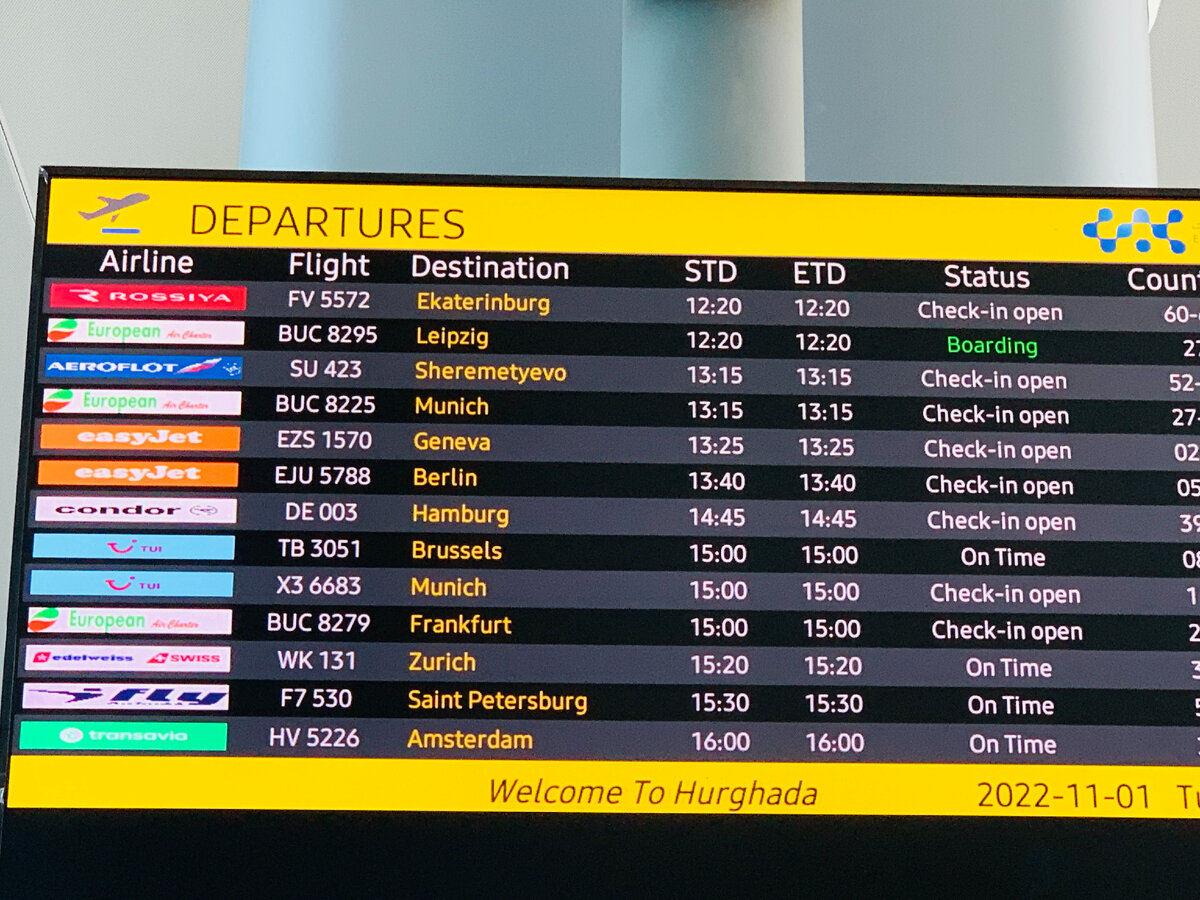 Привет, друзья! Вылетая из аэропорта Хургады, смотрел на табло вылетов - следил за своим рейсом в Шереметьево и пришла мысль сделать краткую статистику на 01.11.2022: а кого же больше на пляжах египетского курорта : Получились следующие результаты: 1 место: Германия - 17 рейсов (32,7%) 🇩🇪 2 место: Россия - 8 рейсов (15,4%) (но с учетом того, что из Турции всё-таки и наши туристы летают - то за Россией твердое 2-ое место это точно !!!) 🇷🇺 3 место: Британия она же Англия))) - 7 рейсов (13,5%) 🏴 4 место: Швейцария, Нидерланды, Турция, Чехия - по 3 рейса у каждой страны (5,7% на каждого) - с учетом пояснений по 2-му месту скорее турки на 5-6 месте))) 🇨🇭, 🇳🇱 , 🇹🇷 5 место: Литва и Люксембург - по 2 рейса на каждого (3,8% на каждого) 🇱🇹 и 🇱🇺 6 место: Бельгия, Словакия, Беларусь, Болгария - по 1-му рейсу на каждого (по 1,9% на каждого "брата", хотя некоторые уже нам не "братья") 🇧🇪 , 🇸🇰 , 🇧🇾 , 🇧🇬 В нашем отеле отдыхали также представители следующих стран: Лат