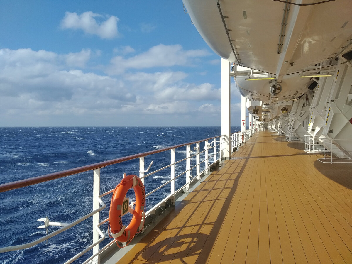 Если шторм застает лайнер в так называемый «день в море», жизнь у большинства пассажиров не замирает. Люди гуляют по внутренним помещениям, барам, ресторанам, участвуют в мероприятиях, смотрят шоу в театре, обедают и ужинают в ресторанах. Если шторм существенный и на открытых палубах находиться так себе идея, там пусто. Бывает открытые палубы и закрывают на время, в целях безопасности, но это редко. Я по открытым палубам в шторм брожу, любуюсь стихией, снимаю.