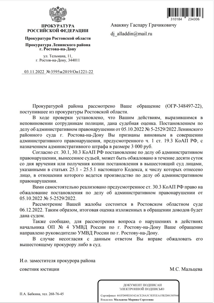 Все структуры брошены на защиту начальника полиции отдела №4 Шаповалова Дмитрия Николаевича по факту применения физической силы за то что якобы я отказался прекратить видеосъемку в общественном месте... Прокуратура говорит нельзя привлечь Шаповалова так как Ленинский суд сделал меня виноватым, обжалование состоится в Ростовском обл суде 06.12.2022 . Следственный комитет по Ленинскому району вызывает меня для дачи объяснений . Я окончательно потерял веру в то что нас граждан могут защитить от беспредела полиции , мы остались один на один со своими проблемами , нам пытаются доказать что в общественном месте снимать на видео сотрудников полиции нельзя , не смотря на федеральные законы и конституцию РФ