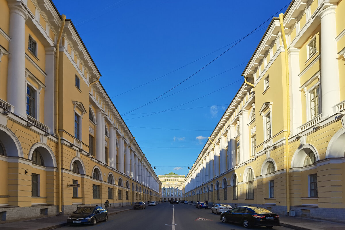 В качестве продолжения темы интересных улиц/переулков Петербурга, после того как мы с вами поговорили о самом коротком переулке... А также о самом узком переулке... И затронули тему ещё одного не самого широкого переулка.... Поговорим немного о самой симметричной улице Северной столицы - об улице Зодчего Росси. Всегда хотел сделать фотографию этого живописного места без машин (или практически без машин). Но дело это трудное так как центр города всё-таки. Тем не менее, пару дней назад, проходя мимо, увидел, что транспорта на улице крайне мало, потому запечатлел эту красоту! Улица была так названа в честь архитектора Карла Ивановича Росси. Она берёт своё начало у Александринского театра и ведёт к площади Ломоносова. Её протяжённость составляет 220 метров, а ширина 22 метра. Тоже не самая длинная для нашего города, к слову. Улица состоит из пяти зданий, построенных по единому проекту с единым фасадом. Отчего создаётся впечатление, что на каждой стороне улицы — по одному зданию. Хотя на с