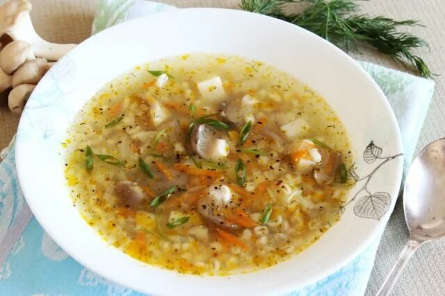 Ингредиенты: 100 г ячневой крупы, 1 луковица, 1/2 корня петрушки, 1 морковь, 1 л мясного бульон 1 cm. ложка сливочного масла, соль.