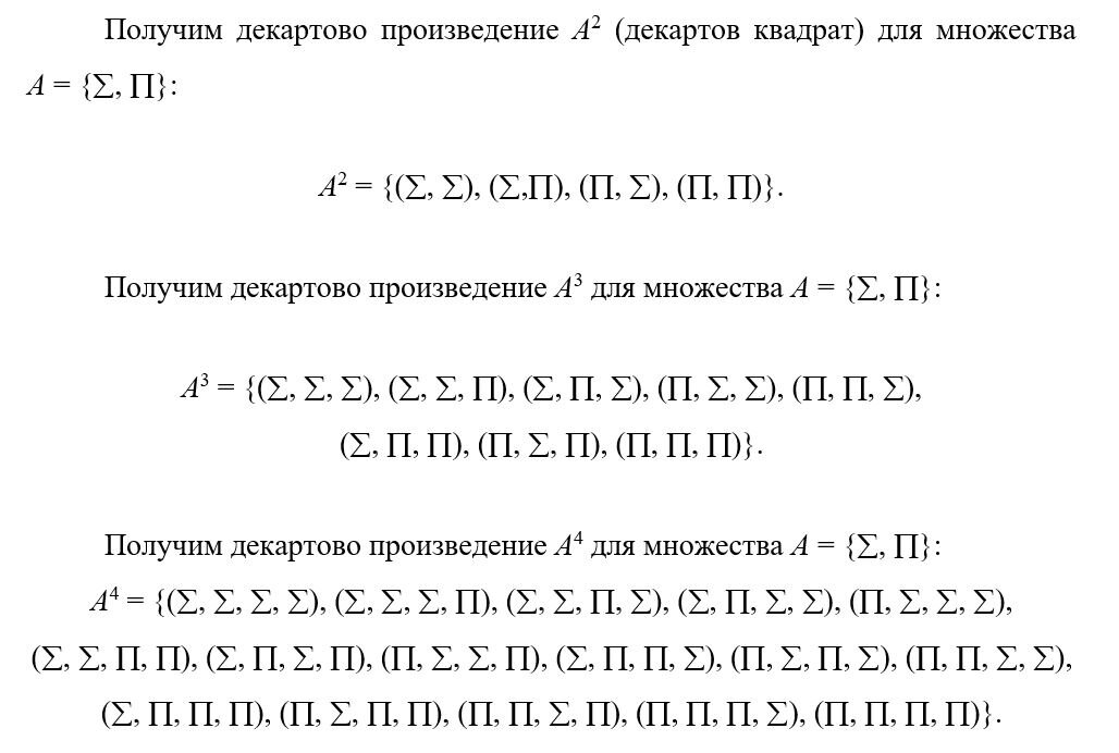 Упражнение 1. Пусть задано множество A, определите следующие декартовы произведения: декартов квадрат (множество A в степени, равной 2), декартов куб (множество A в степени, равной 3) и множество A в степени, равной 4.