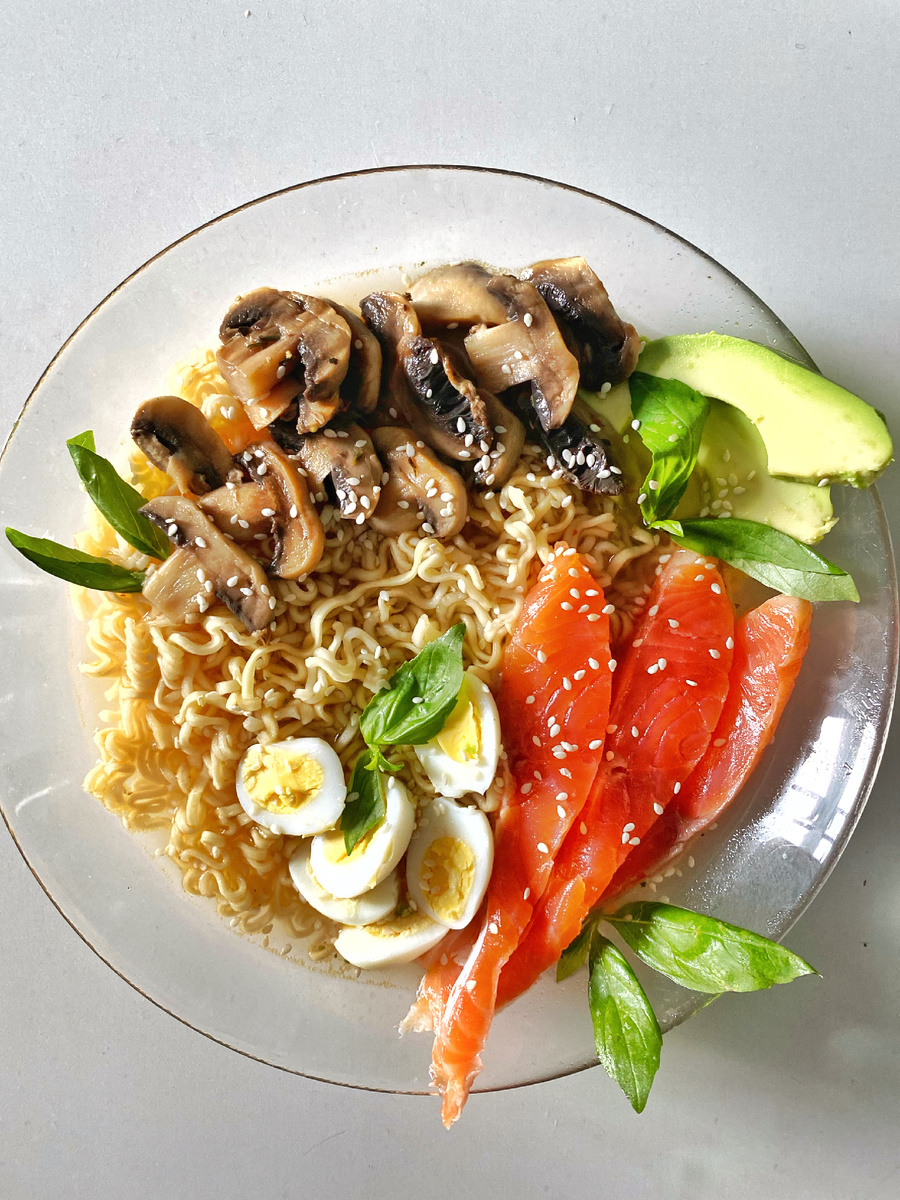 Что понадобится для приготовления: Для начала мы завариваем лапшу в отдельной посуде. Далее ставим варить 3 перепелиных яйца, после закипания варить примерно 4-5 минут. Далее, пока варятся яйца, моем и чистим грибы. Далее нарезаем их, как вам нравится. Обжариваем их на сливочном масле. После наша лапша должна завариться, выкладываем ее в подходящую посуд, бульон можно слить. После того как выложили, начинаем выкладывать все остальное, а это грибы, разрезанные яйца пополам. Далее берем форель, нарезаем ее тонкими кусочками , ну и конечно авокадо, так же нарезаем. Все это выкладываем сверху на тарелку. Украшаем зеленым базиликом и посыпаем слегка кунжутом😊 Все, блюдо готово ✅ Приятного Вам аппетита!