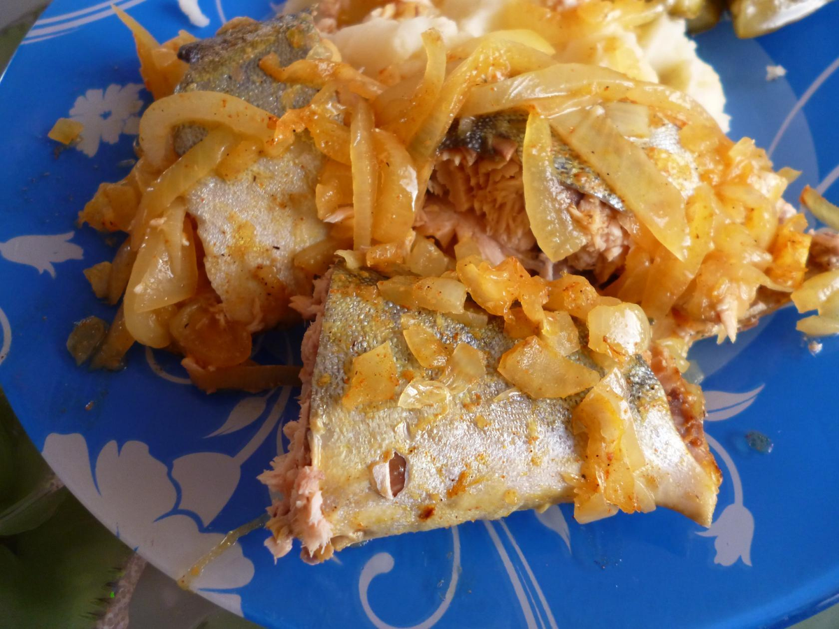 На подушку из лука выложить рыбу на спину и раздвинуть бока, чтобы мякоть брюшка стала видна.