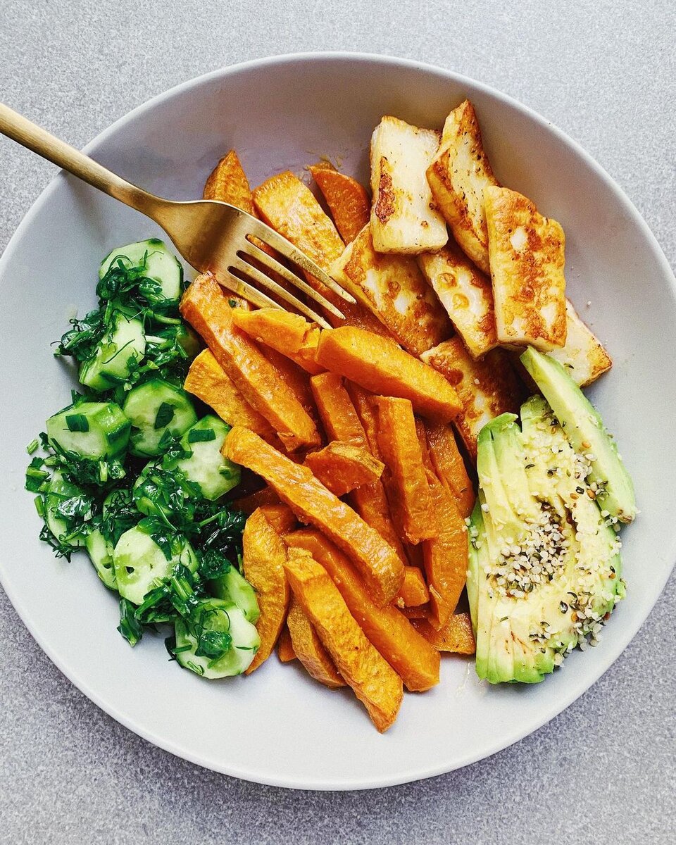 После большого стакана воды с лимоном примерно через час я съедаю что-то из свежих фруктов или пью зелёный или морковный фреш. Ближе к полудню — первый полноценный приём пищи. Пять дней в неделю я обедаю и ужинаю в ближайших к офису кафе. И в будни, и выходные я стремлюсь к формуле питания, о которой говорит Надя Андреева и другие специалисты по здоровью: 50% тарелки составляют овощи, 25% углеводы и жиры и 25% белки. Углеводы в моём случае — это гречка, киноа, бобовые, паста из полбы, дикий рис, картофель или батат. Белки — яйца, рыба, морепродукты, чечевица. Жиры тоже пристутствуют в каждом приёме пищи — авокадо, оливковое масло, гхи, конопляные семечки, орехи (опять же рыба, яйца).