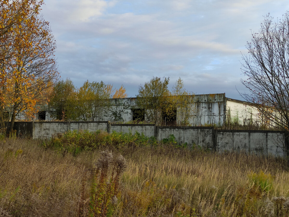 По пути в поселок располагается уже заброшенная огромная птицефабрика, вот несколько ее зданий.