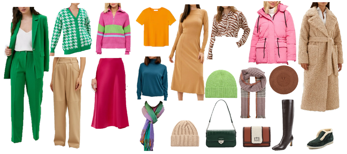 Самых ярких девченок- весенних- я оставила на закуску. Зато для них у меня очень яркая и разноплановая капсула. Все вещи выбраны на Ламоде и показаны с ценами и ссылками. Ссылки на капсулы для других цветотипов вы найдете в конце статьи. Итак, состав капсулы: 1. Костюм SashaOstrov за 14 952 ₽ (было 29 320) или Костюм за 5 463 ₽ (было 10 199) 2. Кардиган Moki за 2 967 ₽ (было 9 999) 3. Джемпер Sela за 2 999 ₽ 4. Футболка Mango за 1 299 5. Водолазка Zarina за 1 559 ₽ (было 2 399 6. Платье Mark Formelle за 3 480 (было 5 799₽ 7. Блуза Vittoria Vicci за 1 852 ₽ (было 5 490 8. Юбка Zarina LIMITED COLLECTION за 2 599 ₽ (было 2 999) 9. Брюки Zarina за 1 200 ₽ (было 4 599 10. Куртка утепленная Sela за 6 599 ₽ 11. Шуба Paradox за 14 019 ₽ (было 21 990 12. Шапка Sela за 999 ₽ 13. Шапка Snow Airwolf за 1 271 ₽ (было 2 499) 14. Берет Ruxara за 1 000 ₽ 15. Палантин Mon mua за 1 267 ₽ (было 2 890) 16. Палантин Chale за 1 990 17. Сумка Keddo 2 975 ₽ (было 5 399) 18. Сумка David Jones за 2