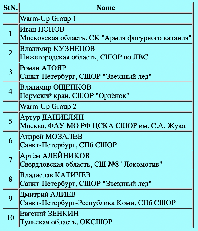 Делюсь впечатлениями от лучших выступлений мужчин на турнире (кто набрал больше 70 баллов), показываю баллы и протоколы. На фоне остальных дисциплин выступление мужчин можно было считать самым непредсказуемым, хотя и это не уровень мировых стартов, конечно. Наибольший интерес для меня представляли Дмитрий Алиев и Андрей Мозолёв. Стартовый состав: Иван ПОПОВ - Московская область Думаю, Ивана хорошо запомнили по его прошлому турниру. Он заявил неплохой прыжковый набор с квад-тулупом. Музыка странная, но под эти завывания фигуристу неплохо удалось показать работу тела, эдакий контемпорари (стиль танца) на льду. Несколько хаотичная дорожка, но в целом впечатление у меня приятное от этого проката. Результат КП: 85.90 Роман АТОЯР - Санкт-Петербург Не очень поняла программу, и прокат в целом не зацепил. Роман заходил на четверной сальхов, но не докрутил пол-оборота, зато обошлось без падения. Тройной аксель и каскад тоже не удались. Результат КП: 76.13 Артур ДАНИЕЛЯН - Москва Плохо выполнил в
