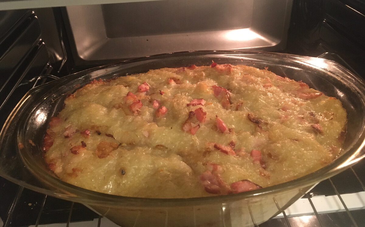 Это рецепт традиционной белорусской кухни, однако, также его можно встретить под разными названиями в литовской и полькой кухнях. Готовили ее крестьяне в чугунках в русских печках. Блюдо получается необычайно вкусное и сытное. Для тех кто любит картофель настоятельно рекомендую! Для рецепта нам понадобится: Грудинка варёно-копчёная — 300 г Лук репчатый — 2 шт Мука — 1 ст. л. Соль (по вкусу) Катрофель — 1-1,5 кг Сметана, зелень для подачи Для начала нужно почистить и натереть на мелкой тёрке картофель. После чего, если кашица подучилась очень жидкая, нужно слить часть сока, отстоять его, чтобы отделился крахмал, который добавить опять к картофелю. Также добавляем столовую ложку муки и солим. Затем режем грудинку на кубики. И обжариваем до золотистости. В классическом рецепте берут шпик, можно использовать и фарш, или вообще сделать вегетарианский вариант с грибами. Как только грудинка обжарилась, аккуратно выкладываем ее со сковородки, оставляя вытопленный жир, на котором обжари