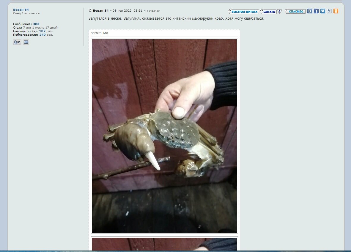 Листаю странички местного форума, вижу новость: в черте города, не далеко от меня, пойман краб! Хм интересненько.😉 Владелец снимка облегчил задачу, выяснив заранее в сети, что это Китайский мохнаторукий краб, или шанхайский волосатый краб (лат. Eriocheir sinensis) Пересказывать вики или любой другой справочный ресурс не буду, кратенько лишь скажу, что краб легко адаптируется , живет в пресной и соленой воде, уже заполонил водоемы Германии и прочей Европы с начала 20-го века, прибыв в виде личинок в балластных водах. Также видел в сети статейки, что крабов уже ловят в нижнем течении Волги, а вот теперь и у нас. Кстати, описанный случай поимки уже не первый, потому можно говорить, что живность тут прижилась. Радоваться этому или нет, покажет время... Китайцы разводят данных крабов на мясо, считая его деликатесом, мы значит, тоже теперь отведаем легально краба. Учитывая, что за камчатского у нас еще могут наказать, а про этого пока ни слова.😉 Краб питается преимущественно растительной п