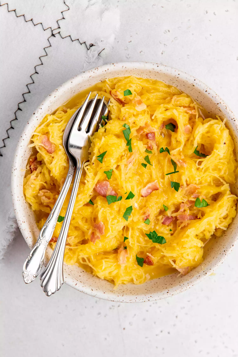 Разогрейте духовку до 200°. Приготовление кабачковых спагетти: Разрежьте тыкву-спагетти вдоль пополам и выскоблите семена. Смажьте срезы оливковым маслом и посыпьте солью. Положите тыкву срезом вниз на противень и запекайте, пока вы не сможете легко проткнуть внутреннюю часть вилкой, около 40 минут. Используйте вилку, чтобы соскрести нити тыквы-спагетти в миску. Выбросьте кожуру. Приготовить панчетту: Добавьте панчетту в сковороду на среднем огне. Обжаривайте до слегка хрустящей корочки по краям, около 5 минут. Добавьте в сковороду чеснок и жарьте еще 2 минуты. Снимите с огня и отложите. Приготовить соус карбонара: В средней миске смешайте яйца и тертый сыр пармезан. Приправить солью и перцем. Соединить все ингредиенты: Добавьте тыкву-спагетти, панчетту и чеснок в большую сковороду на среднем огне. Используйте лопатку, чтобы обжарить ингредиенты вместе на среднем огне в течение 2 минут. Выключить огонь и влить соус карбонара. Сразу же энергично перемешайте тыквенные спагетти и соус кар