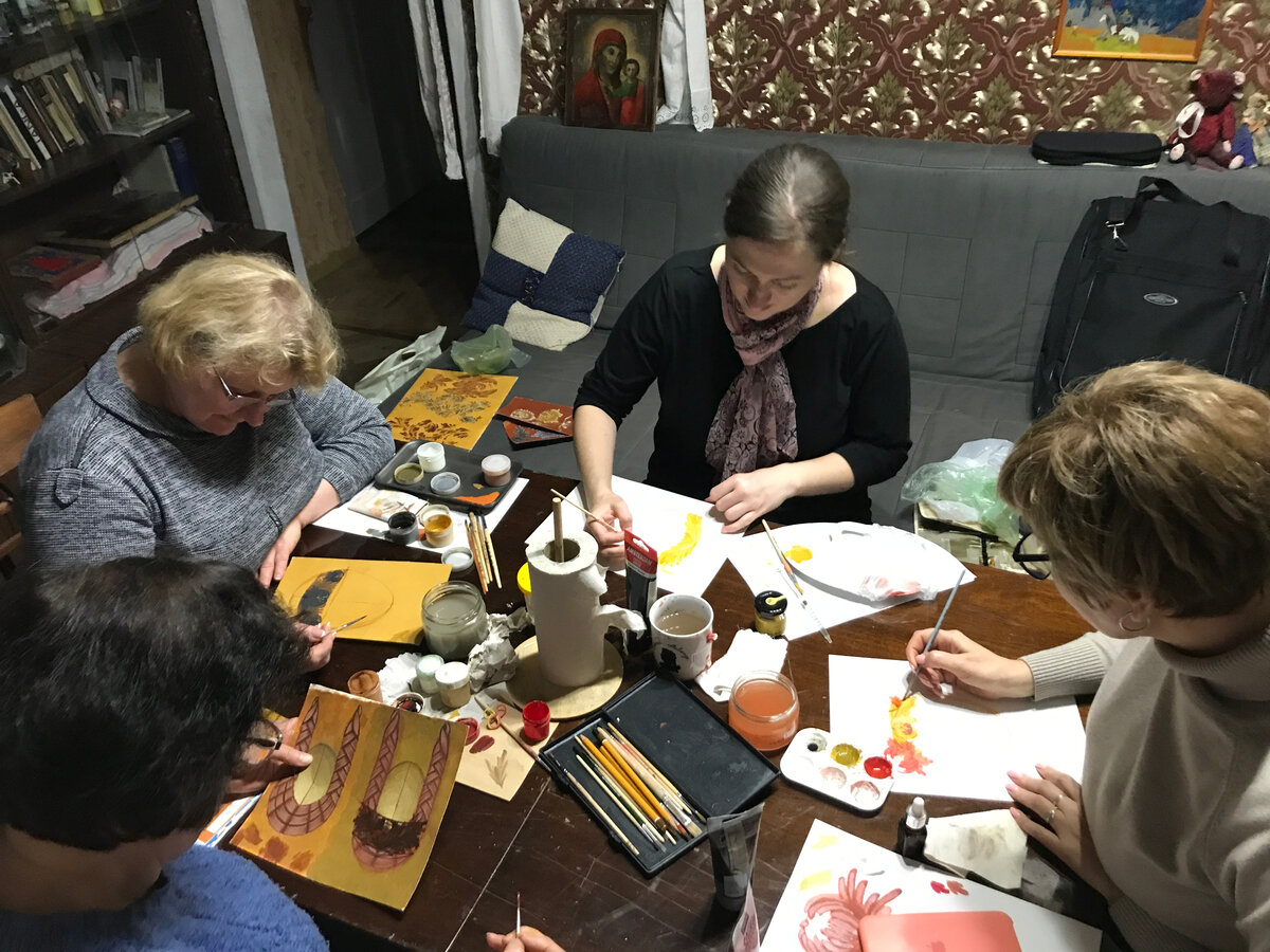 Создать округлую форму хороших пропорций, используя буквально один и тот же приём: И ещё вариация - тоже цветочек, тоже сфера, по которой лежат мягкие лепестки: И ещё: мы рисуем много, эти умения потом пригождаются постоянно. Вот вариант с несколькими ярусами лепестков - и тут включается умение создавать объём, используя изменение силы света. Все работы - ученические; поэтому в них видны класические ошибки и поиски. Из таких отдельных цветков и бутонов вырастают гирлянды и букеты, на которые можно сажать райских птиц, добавлять лёгкие прозрачные драпировки, блестящие античные вазы. Всё это - тренировка базовых, повторюсь, доя иконописца умений: сферический объём без пузырей, мягкая моделировка, хорошее грамотное освещение, неагрессивное цветовое решение. Букеты небесно-голубых роз - образцовые: А вот и первые гирлянды, задача посложнее: кроме ритмичного заполнения пространства нужно создать единое целое так, чтоб части органически соединялись друг с другом - не выламываяс