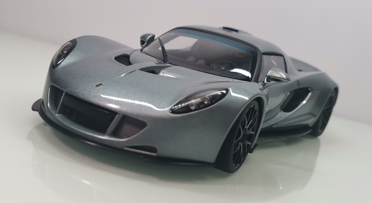 Производитель: AutoArt Серия: Signature Материал: металлический сплав (diecast) Год производства модели/оригинала: 2015/2011 Статус: есть в продаже Давно думал над покупкой этой модели, но как-то все не складывалось, точнее, все время откладывал покупку, так как на горизонте возникали другие, более актуальные модели, да и ценник на Hennessey говорил о том, что я еще успею, и тут пришла мне, и не только мне, рассылка от одного немецкого интернет магазина и цена на серую и белую модели стояла 67 евро. 67 евро на артовскую Сигнатуру в металле! Короче, я щелкнул кнопкой моментально и не зря, продавец регулировал цену по мере снижения складского остатка. На момент завершения покупки, за белую уже просили 150 евро, за серую, чуть меньше. В итоге, модель вышла чуть больше 82 евро с доставкой. Одна из последних моделей от Арта в металле, как раз в 2015 году они активно переходили на пластик. Модель выпускалась в сером, матовом черном, белом (в том числе с наклейками как на версии, поставившей