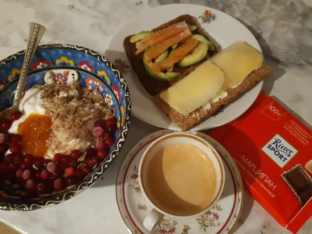 О своих запасах продуктов и планах по бюджету на питание в ноябре я рассказывала ЗДЕСЬ Первая крупная закупка - Вкусвилл, Метро, Лента, КБ и Глобус КАТАЛОГ РЕЦЕПТОВ - здесь все рецепты и полезные статьи по экономии, которые есть на канале Каталог: все статьи по экономии и ведению бюджета на завтрак сегодня мягкий творог с медом, брусникой и жмыхом грецкого ореха. К кофе - бутерброды с авокадо и кижучем и на хлебцах бутерброд со сливочным маслом и пармезаном. Плюс шоколад, но я его не ела - не осилила уже. на работу брала кусочек жареной курицы и салат из пекинской капусты с огурцом и болгарским перцем. После работы заезжала во Вкусвилл. Вот что купила. Подробно расскажу в понедельник в статье о закупках за неделю. На выходные хотелось купить вкусненького - побаловать детей. Они просили манго и мороженое. Мой полдник: хурма из ВВ, огромная, ок 350 г, чашка кофе и чак-чак. Чак-чак купил мне в подарок младший сынуля по дороге из школы на свои карманные деньги. Дети ели манго, и мне то