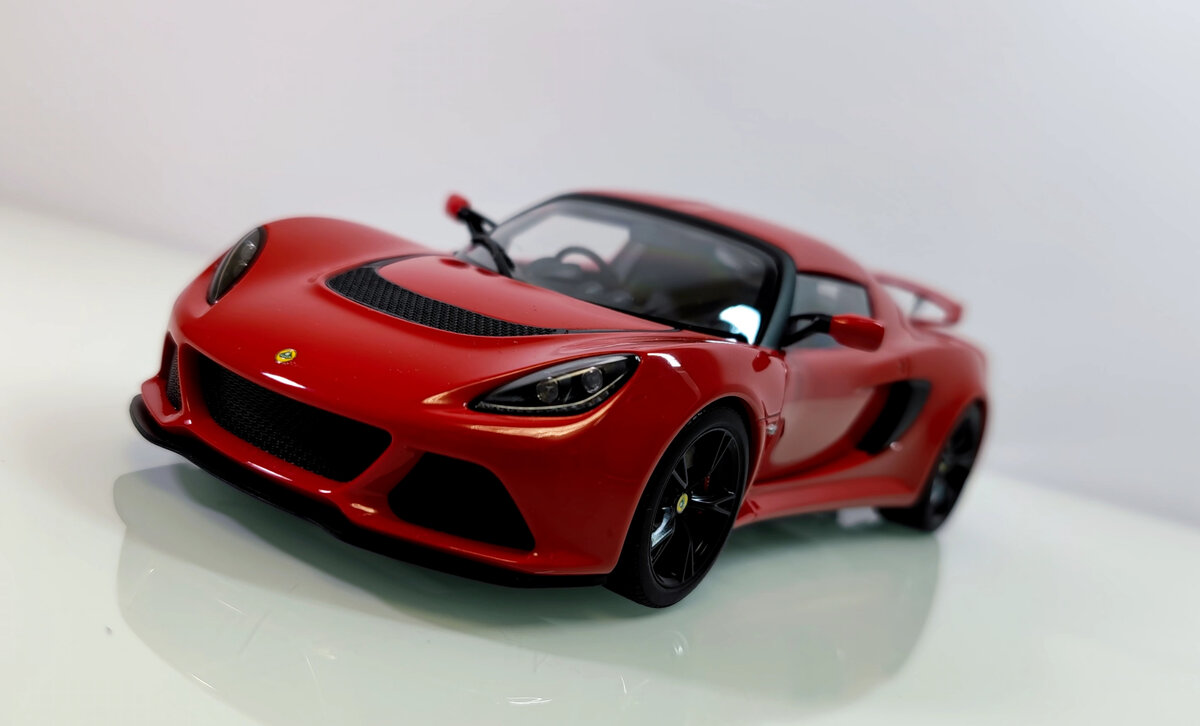 Производитель: AutoArt Серия: - Материал: пластик (composite diecast) Год производства модели/оригинала: 2015/2015 Статус: доступно к покупке Модель Lotus Exige была выпущена довольно давно, но тут недавно появилась у китайцев на солидных скидках. Взял на перспективу, что называется, так как не коллекционирую правый руль, а модель очень хороша. АвтоАрт выпустил модель в белом, желтом и красном цветах, все смотрятся довольно удачно и все с темными салонами. Модель пластиковая, но это не очень заметно. Передняя секция не открывается, как и на оригинале, а в целом модель имеет стандартный для АвтоАрта функционал Сзади под прозрачной крышкой, удерживающейся на стойках, скрывается двигатель V6 3,5 литра от Toyota, в версии 2015 года он развивал 345 л.с., что обеспечивало авто максимальную скорость в 277 км/ч и разгон до первой сотни за 3,9 секунды. АвтоАрт хорошо работает с материалами и это особенно проявляется, когда они делают темные салоны. Немного цветных вставок разнообразят салон В д
