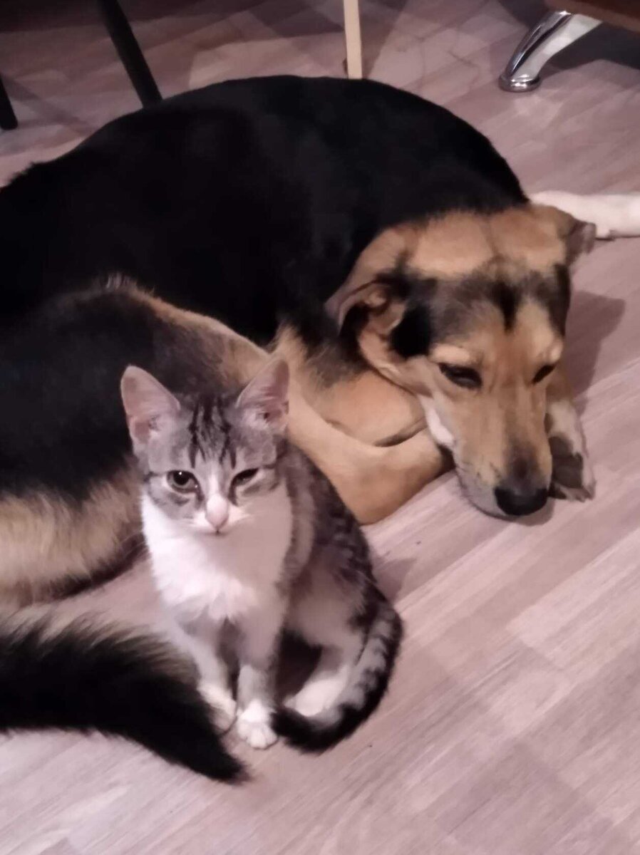 Когда ему было около года, кошка моей мамы принесла двоих котят. Только житья им в доме от собаки Бони не стало. Она то и дело лезла к ним, пытаясь поиграть. А игры такие до добра не доводят, однажды так она уже "заиграла" котёнка. Мама попросила забрать котят к себе, как только она научились есть.