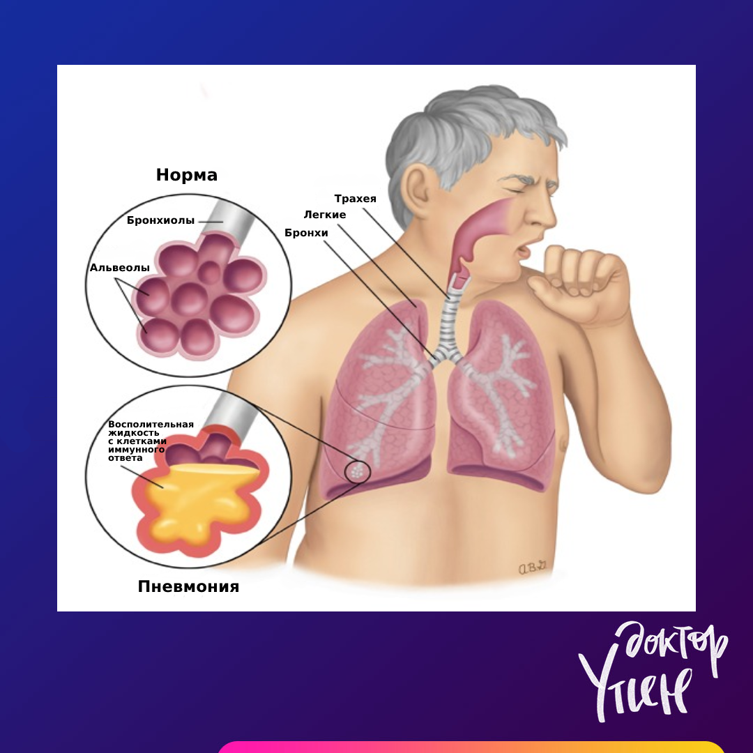 Друзья, сегодня Всемирный день борьбы с пневмонией. Пневмония — это воспаление легочных тканей, обычно вызванное инфекцией (бактериями, вирусами и другими микроорганизмами). Особенно тяжело оно протекает у маленьких детей, людей старше 65 лет и людей с хроническими заболеваниями. Это самая распространенная причина смерти от инфекционных заболеваний в мире. На картинке вы видите альвеолы. Это такие мешочки, похожие на гроздья винограда. Они густо оплетены кровеносными сосудами. И именно в альвеолах и происходит газообмен – кровь насыщается кислородом и отдает углекислый газ. Патогены вызывают воспалительный ответ и альвеолы заполняются воспалительной жидкостью. Отсюда и возникают основные симптомы пневмонии. Кашель – организм пытается освободиться от мешающей мокроты, повышение температуры – универсальная реакция на возбудителя, одышка – альвеолы заполнены воспалительным экссудатом, мешающим газообмену. Симптомы пневмонии: Если вы заподозрили у себя симптомы пневмонии, то как можно с
