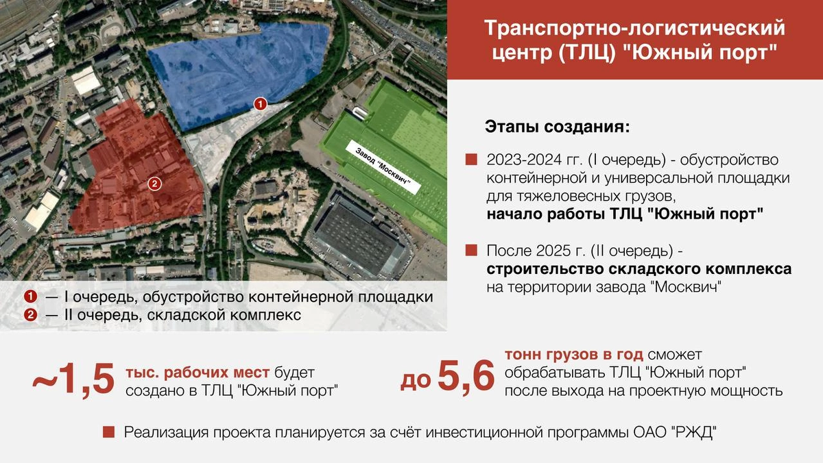 Даешь Логистический центр для Москвича. Самого автомобиля пока нет, но его будет как обещают очень много. Каким-то образом Московский завод Рено обходился теми транспортными возможностями, которые были прежде. А для Москвича построят аж транспортно-логистический центр на миллионы тонн грузов. Вот мэр города Сергей Собянин сообщает: "В конце этого года автозавод "Москвич" планирует возобновить сборку автомобилей. Для развития производства понадобится наладить доставку необходимых грузов. Заключим с РЖД, Московским автомобильным заводом и "КАМАЗом" соглашение о создании в Печатниках нового транспортно-логистического центра "Южный порт". Будут построены контейнерная и универсальная площадки для тяжеловесных грузов, а также складской комплекс. После открытия основную загрузку ТЛЦ обеспечит "Москвич". С выходом на полную мощность центр сможет обрабатывать до 5,6 млн тонн грузов в год для различных предприятий Москвы, в том числе "Москвича". Будет создано около 1,5 тыс. рабочих мест. Таким