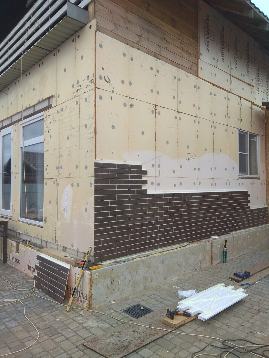 Здравствуйте уважаемые читатели, сегодня вашему вниманию представляется обшивка дома термопанелями (плиты из пенопласта, к ним приклеена плитка). Первый этаж дома сделан из пеноблоков, второй каркасный. Монтировали панели с помощью дюбелей для ячеистого бетона на первом этаже и простыми саморезами на втором. Нужно будет произвести затирку швов, но это с приходом тепла, а пока приклеили панели, установили двери и обналичили окна. До тепла планируем пошить карнизы и установить водосточку