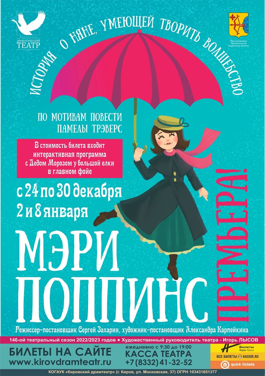 Под новый год труппа Кировского драмтеатра, как всегда, готовит премьерную постановку для юных зрителей. В этом году ею станет спектакль «МЭРИ ПОППИНС», в основе сюжета которого лежит знаменитая серия книг Памелы Треверс.