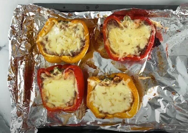 5. Когда перцам останется готовиться 5-10 минут, достаём их, посыпаем сыром и отправляем снова в духовку.