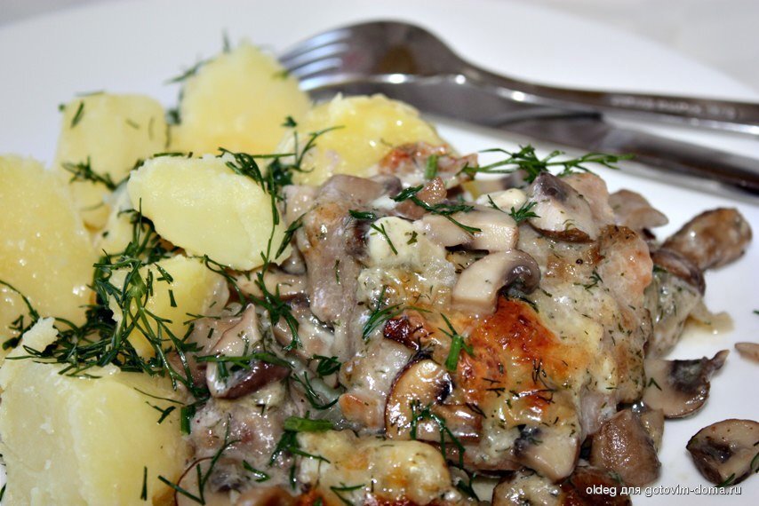Ингредиенты: 800 г нежирной свинины, 200 г шампиньонов, 200 г сыра, 4 ст. ложки панировочных сухарей, черный молотый перец, соль, 3 ст. ложки свиного жира. Для соуса: 5 ст. ложек свиного жира, 2 ст. ложки муки, 2 стакана сливок, белый молотый перец, соль.