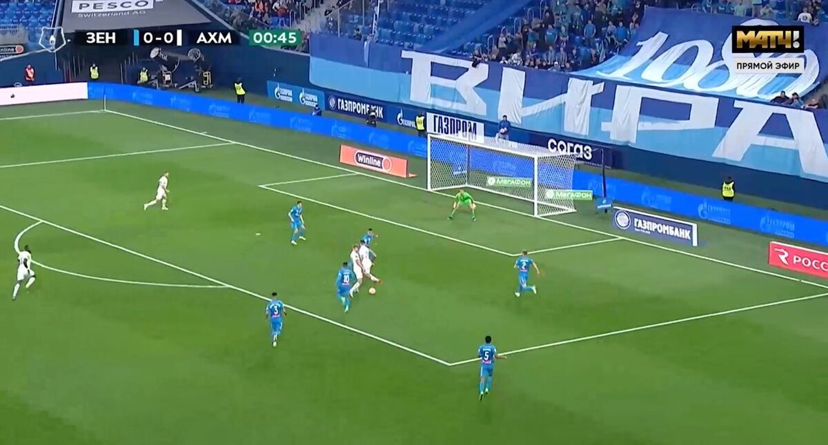 Второй мяч влетел на 8-й минуте: Чистяков долго смотрел на мяч, ожидая, когда он докатится до защитника. Форвард «Ахмата» Мохамед Конате среагировал, влетел в стык, заблокировал передачу Чистякова и перекинул мяч через выскочившего из ворот Кержакова. Реальный привоз. «Зенит» пропустил дважды в первые 10 минут матча в РПЛ впервые с ноября 2010-го – тогда уступал «Сибири» 0:2 к 6-й минуте, но в итоге выиграл 5:2. На 26-й минуте мяч попал в руку Чистякова, но видеоассистент на ВАР пенальти не усмотрел, как и Павел Кукуян в поле. По мнению бывшего арбитра РПЛ Игоря Федотова, это ошибка: «Сначала Чистяков держал руки за спиной, а после удара он начал делать движение руками в сторону мяча – мяч летел в створ ворот, но попал в кисть руки. Правильное решение: 11-метровый удар и желтая карточка».