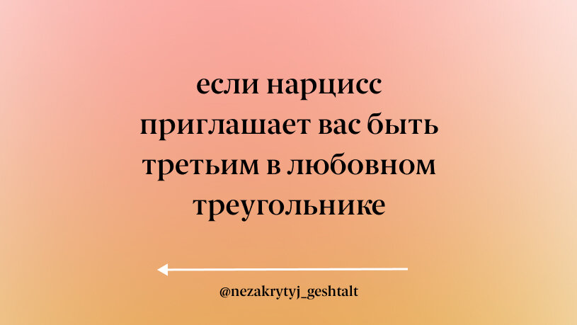 Если нарцисс приглашает вас быть третьим в любовном треугольнике, стоит понять, что его обесценивание вас как личности происходит тотально и полностью уже на этом этапе, дальше, в принципе, можно уже никуда не идти. Почему? Потому что само приглашение - это нарциссический манифест "у меня хватит воли быть в отношениях сразу с несколькими людьми, в то время как твоя воля меня не волнует вообще". Уже в этом месте нарцисс вам транслирует "я имею право брать то, что хочу и где хочу в полном объеме, а ты согласишься на усеченный вариант близости, ты согласишься на условия, которые в первую очередь будут удобны мне, а не тебе". Даже если эта абсолютно грубая и глубокая интервенция, сносящая ваши границы напрочь будет приправлена тонной странных признаний (что именно вы - любовь всей жизни, с вами - связь особенная), жалоб (что если бы основной партнер вел бы себя лучше, ваша связь бы не появилась), сравнений в вашу пользу (как ему жаль, что вы не встретились раньше, а теперь он будет мучитьс