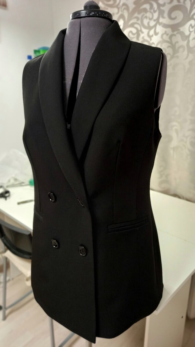 Всем привет! Соскучилась по своему блогу! Да! Как ваше настроение? Надеюсь что все хорошо. Последние несколько дней была очень загруженной, нужно было сделать много дел и работы! Можно сказать что 50% выполнено. За завтра и послезавтра, нужно выполнить оставшиеся проценты))) Итак сегодня я дошила жилет для клиентки. Жилет выполнен из ткани под названием " Пикачу" это костюмная ткань, кстати мне нравится с ней работать) Вот такая получилась жилетка с двубортной застёжкой на пуговицы, на переде вытачки, отрезной бочок, прорезные карманы в рамку, ну и сам жилет на подкладке конечно же) ах да, ну самый мой любимый, просто наилюбимейший элемент это конечно же шалевый воротник! Обожаю эту модель воротника) Я бы с удовольствием хотела себе такую жилетку) черный цвет строгий, просто неотразимо, мне очень нравится! Завтра с клиенткой будем мерить) Принимаю заказы на пошив женской одежды если вы из города Новосибирск! Я буду рада воплотить вашу идею в жизнь, или с радостью придумаю для ва