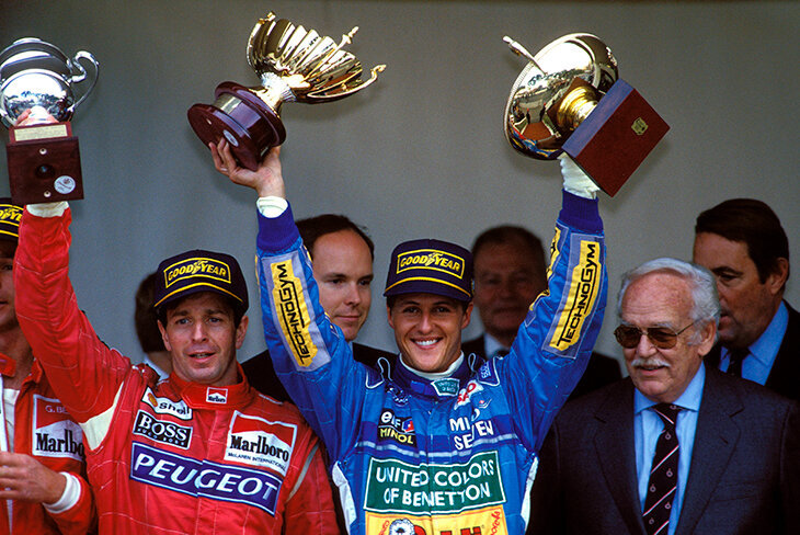 Она работала через прекращение 1 зажигания через каждые 15 штук. По сути команда просто встроила «сбоитель» в источник питания, дающий заряд свечам – он резко снижал мощность на пару миллисекунд. Если обороты мотора не возвращались в лимит, сбои включались чаще – каждые 7 зажиганий, затем каждые 6, 5… Но с восьмицилиндровым мотором обычно стараешься избежать перебоя с зажиганием в том же пистоне слишком часто – иначе создается риск засорения свечи и создания реального постоянного сбоя в зажигании. Хороший пилот при использовании системы сперва изучит, как лучше газовать. Постоянно атаковать везде – это норм, только тратит больше топлива и производит весьма заметные звуки. Команда же пыталась минимизировать видимость использования системы, потому что боялась «уточнений» или изменений правил». Так что если раньше болид Шумахера 94-го был просто подозрительным, то теперь предположения о читерстве можно отправлять в мусорку. Однако отныне неоспорим и факт использования трэкшн-контроля – то есть первый титул Михаэль все-таки выиграл на машине, использовавшей серую зону в регламенте. А Сенна был прав насчет «Бенеттона». Лучшая гонка Шумахера – подиум после 40 кругов на одной пятой передаче. Михаэль перешел на неподходяший «Ф-1» пилотаж, а команда предлагала сход Шумахер поверил инженеру в первой чемпионской команде только после проигрыша спора по настройкам болида. Хотя был дебютантом без опыта Все знают, что Шумахер – великий, но не все знают почему. Объясняем по пунктам Фото: globallookpress.com/imago sportfotodienst via www.im/www.imago-images.de; Gettyimages.ru/Pascal Rondeau, Mike Hewitt/Allsport