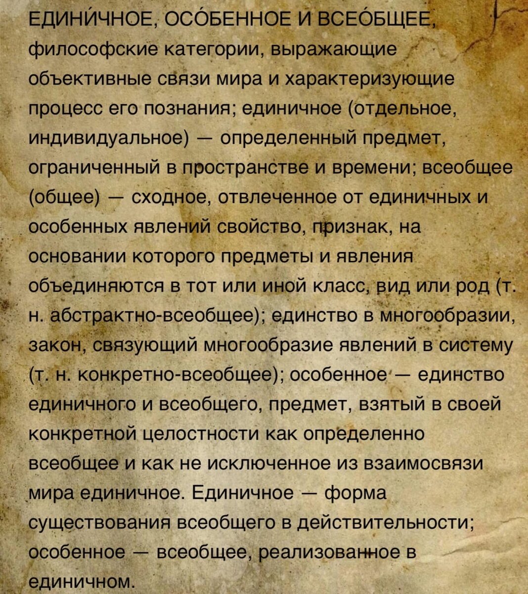 ЕДИНИЧНОЕ, ОСОБЕННОЕ И ВСЕОБЩЕЕ — категории материалистической диалектики, отражающие связь, взаимозависимость и взаимопереходы явлений объективного мира. Для идеалистов и метафизиков решение проблемы единичного и всеобщего было всегда камнем преткновения. Они не видят, не понимают диалектического единства и противоположности единичного и всеобщего, их связи и взаимозависимости. Они идеалисты (субъективные) отрицают всеобщее, превращая единичные явления в комплексы чувственных восприятий. Другие идеалисты (объективные) третируют единичные явления как нечто неважное и несущественное, превращая всеобщее в продукт чистой мысли. Диалектический материализм в противовес идеалистической философии прежде всего утверждает, что понятия единичного, особенные явления, определенные стороны объективной действительности.