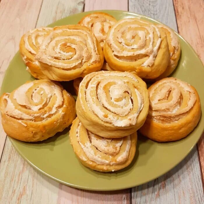 Ингредиенты: 300 г творога, 2—3 стакана муки, 4 яичных белка, 1 стакан сахарной пудры — и мелкого сахарного песка, 300 г сливочного маргарина или масла. Взбить белки с сахарной пудрой в густую пену. По очереди брать колобки теста из холодильника, раскатывать прямоугольником толщиной | см, смазывать сверху взбитым белком, сворачивать рулетом и нарезать поперек. Выложить печенье на противень, смазанный маслом, и выпекать 5—7 минут.
