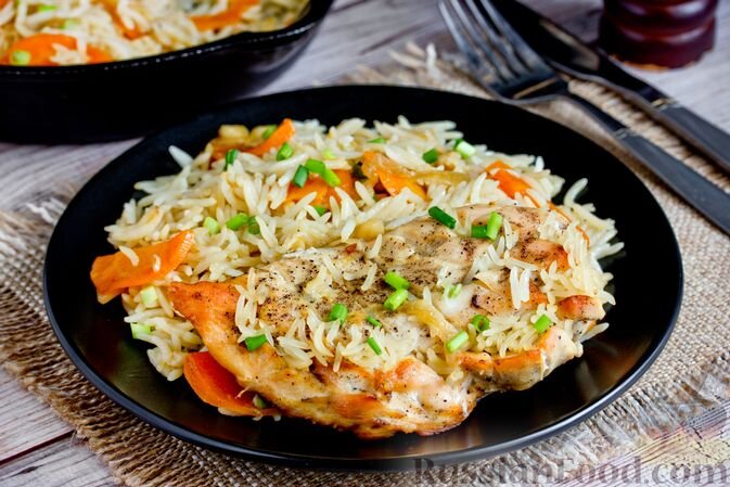 Приготовление полноценных блюд в одной посуде – очень удобный способ быстро накормить семью, так как и основное блюдо, и гарнир к нему готовятся одновременно.Куриное филе с рисом, приготовленное в сковороде, – быстрое и простое блюдо. Дополненный ломтиками моркови рис, получается рассыпчатым, абсолютно не пресным, а куриное филе - сочным внутри и с красивой поджаристой корочкой.