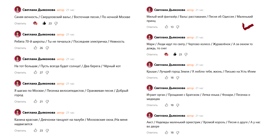 И это 5-й тур нашего мини-проекта. Здравствуйте! Смотрим, как вчера читатели проголосовали и выбираем те песни, за которые голосов меньше. О них и будем сегодня говорить. Милый мой фантазёр Fisherwolf: Начнём с Ларисы Мондрус. Новогодний "Голубой огонёк" с космонавтами Ю. Гагариным, П. Беляевым и А. Леоновым 1965 года с её песней "Милый мой фантазёр", музыка Э. Шварца, слова А. Дмоховского. И я видел этот выпуск сам по телевизору, поэтому и запомнил ещё пацаном. Вальс расставания Fisherwolf: Дальше - незабвенный Ян Абрамович Френкель с его песней на слова К. Ваншенкина "Вальс расставания" в оригинальном исполнении композитора. Но песня была написана в 1965 году для кинофильма "Женщины", где её исполняли дуэтом Н. Сазонова и П. Любешкин. Чем запомнилась - а моя любимая и единственная жена Ленушка под эту песню тщетно пыталась научить меня танцевать вальс... Песня об Одиссее Alexandr Odintsov: Вокальный квартет "Аккорд" - "Песня об Одиссее" (А. Зацепин - Л. Дербенёв). Впервые про