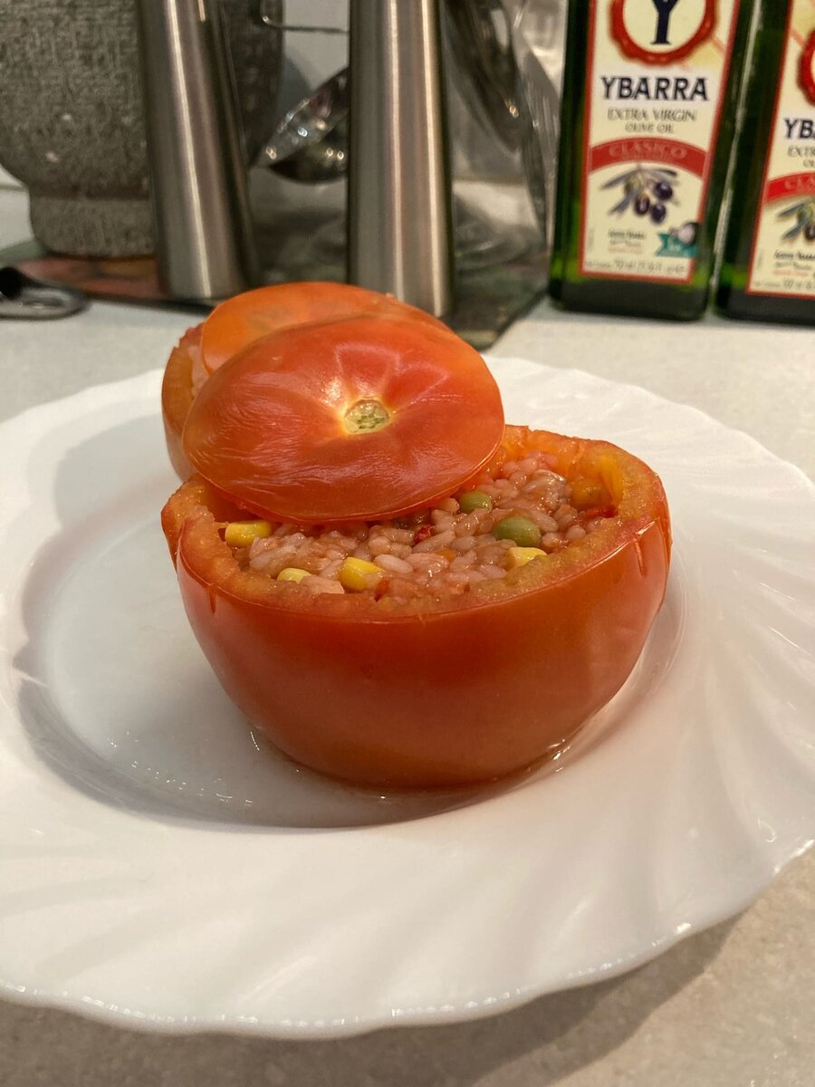 Простой рецепт приготовления сочных фаршированных помидоров в духовке. В качестве начинки мы использовали самую обычную замороженную овощную смесь. На подготовку продуктов уходит минимум времени, а в итоге получается красивое блюдо, которое можно подать на стол в качестве горячей закуски или гарнира к основному блюду. Состав: Срежьте верхушки помидоров и отложите в сторону. Чайной ложкой вычистите мякоть и семена. Мякоть желательно оставить, она нам пригодится в итоге. Отвариваем овощную смесь до готовности (смотрите на упаковке производителя). Чтобы добавить пикантности нашим фаршированным помидорам - мелко шинкуем острый перец чили. Если не любите острое - берите половину перца. Добавляем в овощную смесь перец чили, мякоть помидоров для сочности, а также солим и перчим. После - всё перемешиваем. Подсолите помидоры и нафаршируйте их готовой смесью, сильно утрамбовывая её. Разогрейте духовку до 220С. Смажьте маслом противень. Положите подготовленные помидоры на противень, накройте с