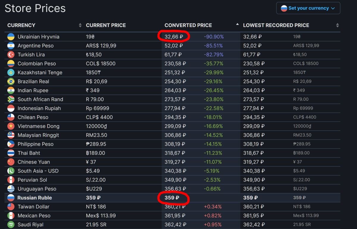 Что касается Турции, то там сейчас инфляция 80%. Если Габен выставит на игры нормальную цену, турки просто не смогут их покупать. Вот и приходится Стиму продавать туркам игры втрое дешевле, чем нам с вами. Аналогичные проблемы с платежеспособностью у Аргентины. В некоторых других странах игры тоже стоят дёшево, — в Колумбии и на Украине, к примеру, — но всё же не совсем дешёво. Такой халявы, как в Турции и в Аргентине, нет больше нигде.