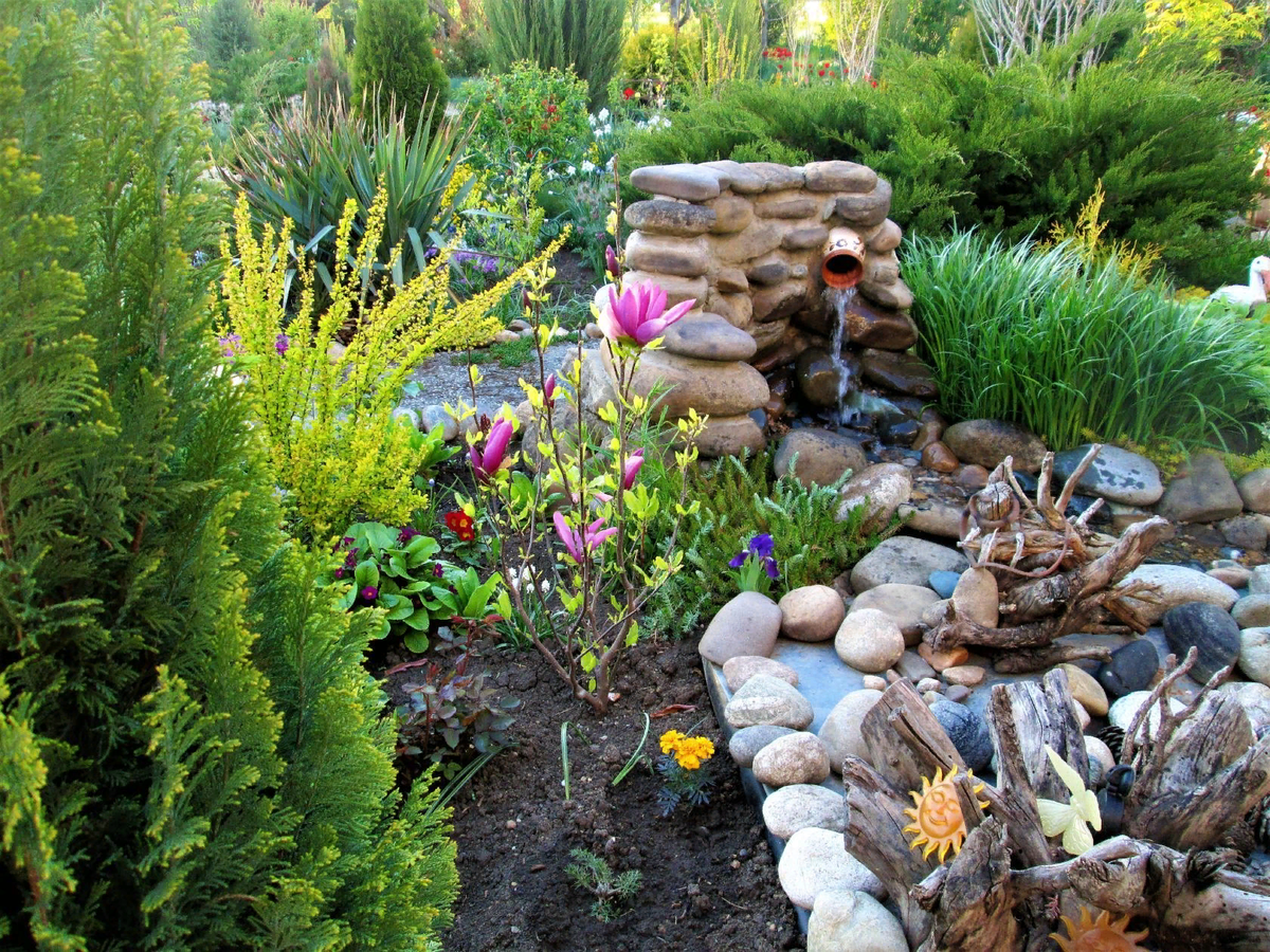 Продолжаю рассказывать, как постепенно рос мой сад. Напомню, что сад находится в Краснодарском крае. г. Тихорецк. Площадь участка 20 соток. В этой статье фото весны и лета 2017 года. Начну с весны! На фото 27.04.2017. КИПАРИСОВИК ЛАВСОНА, БАРБАРИС И МАГНОЛИЯ "СЬЮЗАН" У РУЧЬЯ.