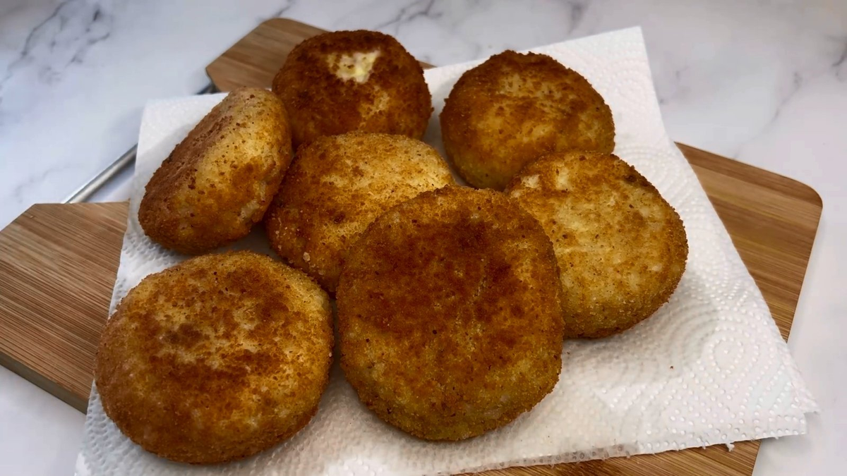 Необычная подача риса с фаршем, очень вкусно. Шаг 1: 400 гр. риса отварить в подсоленной воде. На такой объём риса 600 мл. воды и 1 ст. ложка Шаг 2: лук почистить и нарезать кубиком. Шаг 3: разогреть сковороду и на растительном масле обжарить лук и добавить мясной фарш (400 гр.). Обжарить на среднем огне. Шаг 4: посолить, поперчить, добавить любых специй. Перемешать и выключить плиту. Шаг 5: в вареный рис добавить 50 мл. растопленного сливочного масло, 3 яйца и перемешать. Шаг 6: сформируем фаршированные шарики - Небольшую мисочку покрываем пищевой пленкой и накладываем 2 ложки риса Ложкой распределяем рис по краям миски Накладываем 2 ложки обжаренного фарша За края пленки достаем шарик и аккуратно сцепляем края, помогая пальчиками и крутя пленку. Шаг 7: смешать 2 яйца и 1 ст. ложку просеянной муки до однородной массы. Шаг 8: фаршированные шарики окунуть в яичную смесь, после окунуть в панировочные сухари Шаг 9: разогреваем сковороду, наливаем растительное масло (так чтобы шарики напол