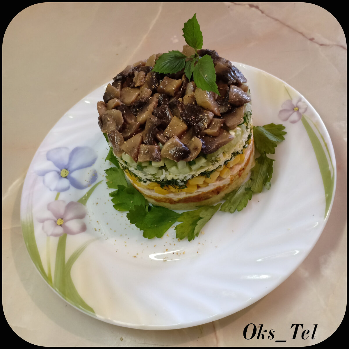 Ну здесь название говорит само за себя. Очень насыщенный и интересный вкус. Сам салат довольно сытный и безумно вкусный. Описывать можно долго, но лучше попробовать самим. ПОНАДОБИТСЯ: - 2-3шт отварного картофеля, - 1 небольшая головка репчатого лука, - 1 средняя морковь, - 1/2 филе куриной грудки, - 1 банка консервированной кукурузы, - 1 пучок укропа, - 3 яйца, сваренных вкрутую, - 1 свежий огурец, - 300г шампиньонов, - 40г сливочного масла, - по вкусу - соль, - майонез. ПРИГОТОВЛЕНИЕ: 1. Очистить лук и морковь. Лук нарезать мелкими кубиками, морковь натереть на терке. Спассеровать овощи на половине сливочного масла. 2. Картофель натереть на мелкой терке и выложить в глубокий салатник. Посолить и смазать майонезом. 3. Следующим слоем выложить спассерованные овощи. Посолить и смазать майонезом. 4. Куриное филе разобрать на волокна и выложить следующим слоем. Посолить и смазать майонезом. 5. С кукурузы слить жидкость и выложить на куриное филе ровным слоем. Сверху смазать майонезом. 6.