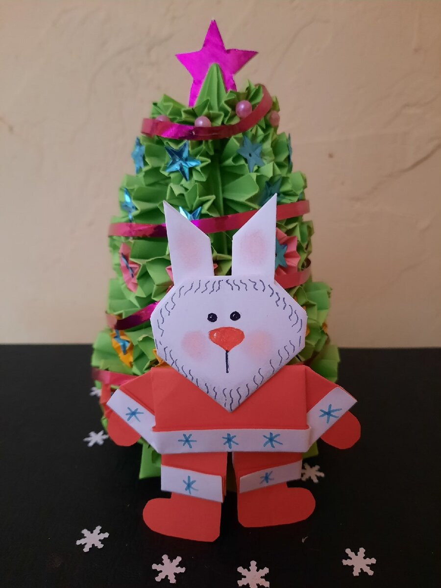 Только выпал первый снежок, а уже у многих блогеров появились новогодние статьи. Я тоже не хочу отставать)) В этой статье я расскажу и покажу, как сделать символ 2023 из бумаги. Это очень простая новогодняя поделка может украсить новогоднюю открытку или упаковку, а может поселиться на ёлочке. Подходит для работы с детьми. Потребуется совсем немного материалов и минут 10-15 вашего времени. Нужны три бумажных квадрата со стороной 10см: два белых, один красный. Начинаем с мордочки зайца. Складываем белый квадрат по диагонали. Со стороны сгиба (там, где основание треугольника) отгибаем на себя полоску шириной около 1 см. В верхней части тоже отгибаем уголок с высотой 1 см. Поднимаем уши наверх Я оставляю между ушами некоторое расстояние. В классическом варианте уши складывают впритык)) Немного загибаю уголки по бокам головы Переворачиваю и рисую мордочку. В случае, если борода у зайца не нужна, можно загнуть уголок в нижней части. Мне показалась, что у новогоднего зайца борода будет умес
