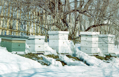 У слабых семей нижний леток открывают на 2–3 см, верхний закрывают. Подкрышники и летки закрыты металлической сеткой от проникновения мышей.