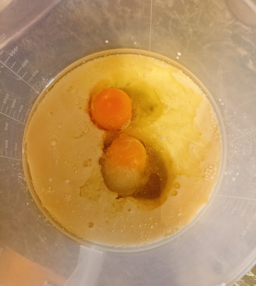 В миску для смешивания кладём все жидкие ингредиенты и сахар.