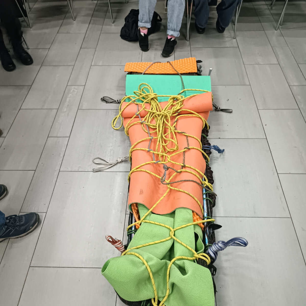 На ней новичкам рассказывали как проводятся спас. работы в горах и как из подручных средств сделать носилки. В данном случае подручные средства это 50 метров веревки 10мм, 20 метров веревки 6мм, пара карематов, 6 альпинистских обвязок и 2 комплекта трекинговых палок. Так как подобные носилки вязать я умею, подумал почему бы не побыть подопытным. Однако пару новых моментов по ходу все же узнал!
