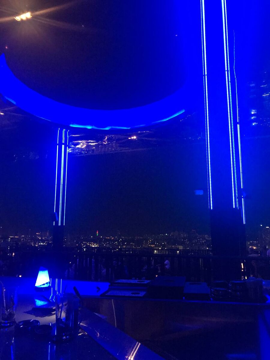 Пространство представляет собой открытую террасу, расположенную на огромной высоте, с которой открывается умопомрачительный вид на городскую панораму, особенно в вечернее время. Неоновое освещение в сине-голубых тонах, проектор, транслирующий планетарные мотивы на стену, "острая" геометрия барной стойки сочетаются с плетёной мебелью и удобными округлыми диванами. Вечером такой интерьер навевает мысли о том, что ты ужинаешь на другой планете или, как минимум, в космическом корабле.